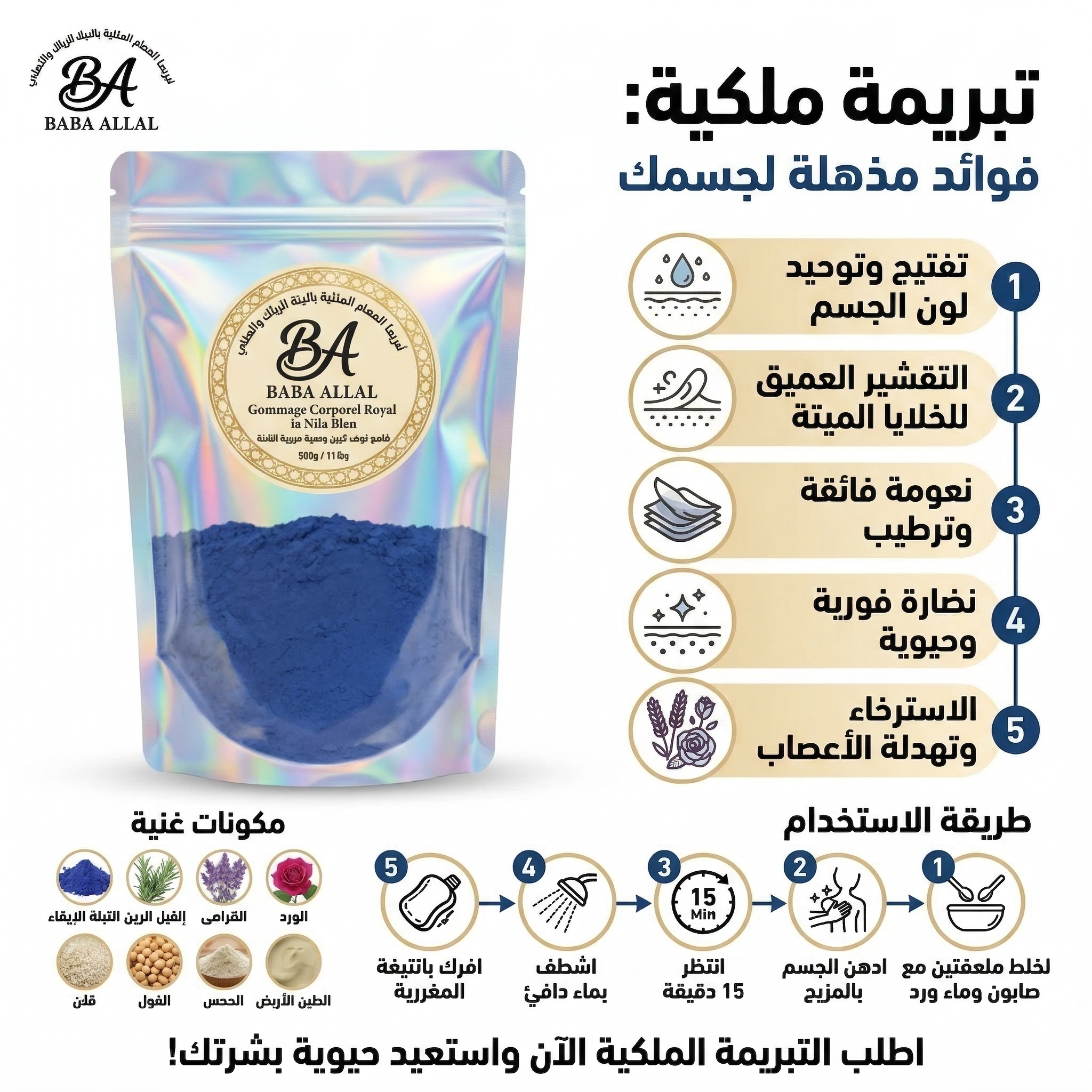استعيدي إشراقة بشرتكِ ونعومتها في 15 دقيقة فقط! تبريمة ‘بابا علال’ الملكية هي مزيج سحري من النيلة الزرقاء الحرة و10 أعشاب طبيعية لتقشير الجلد الميت وتفتيح التصبغات من أول استخدام. عيشي تجربة الحمام المغربي الفاخر في بيتك